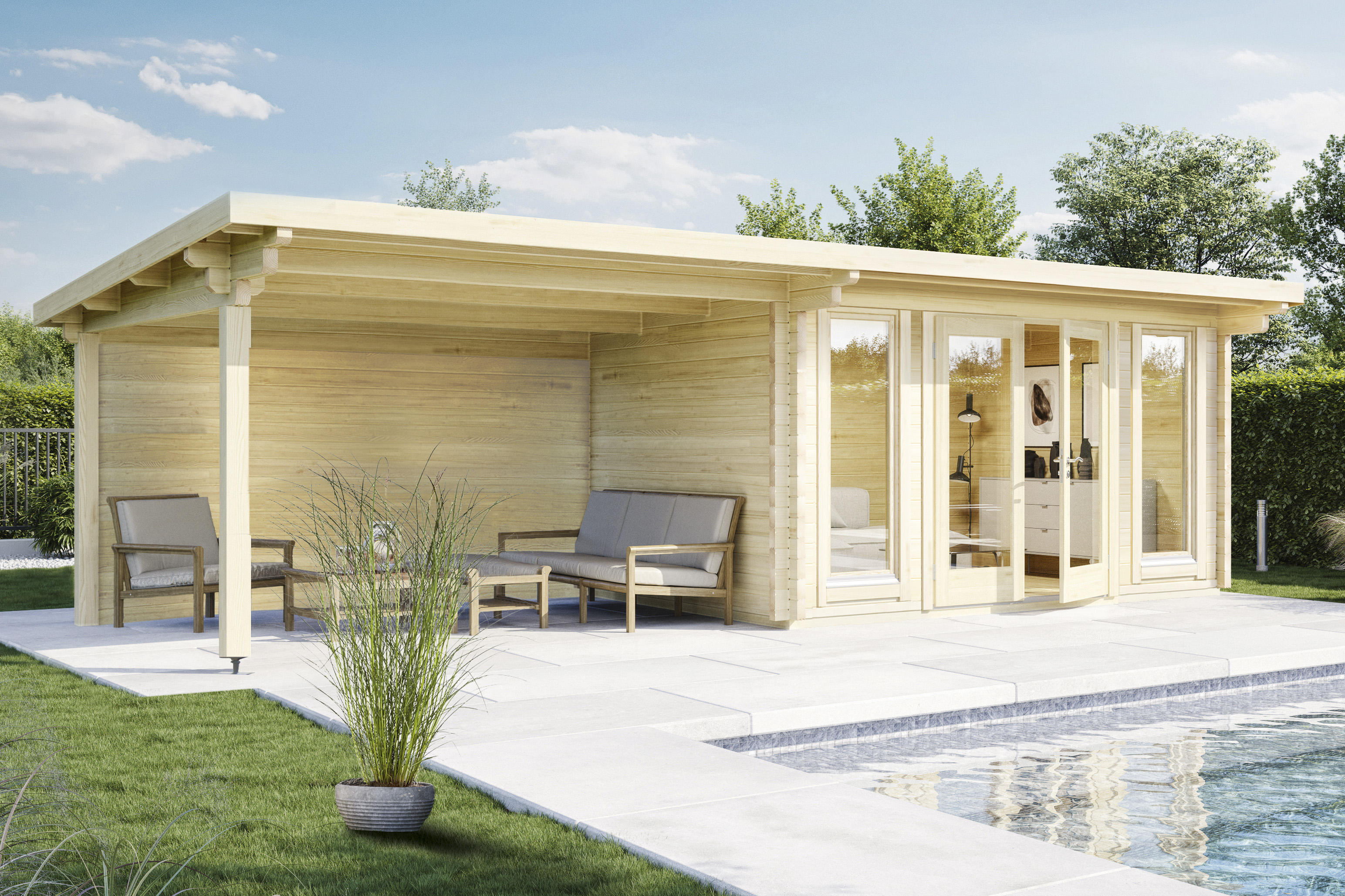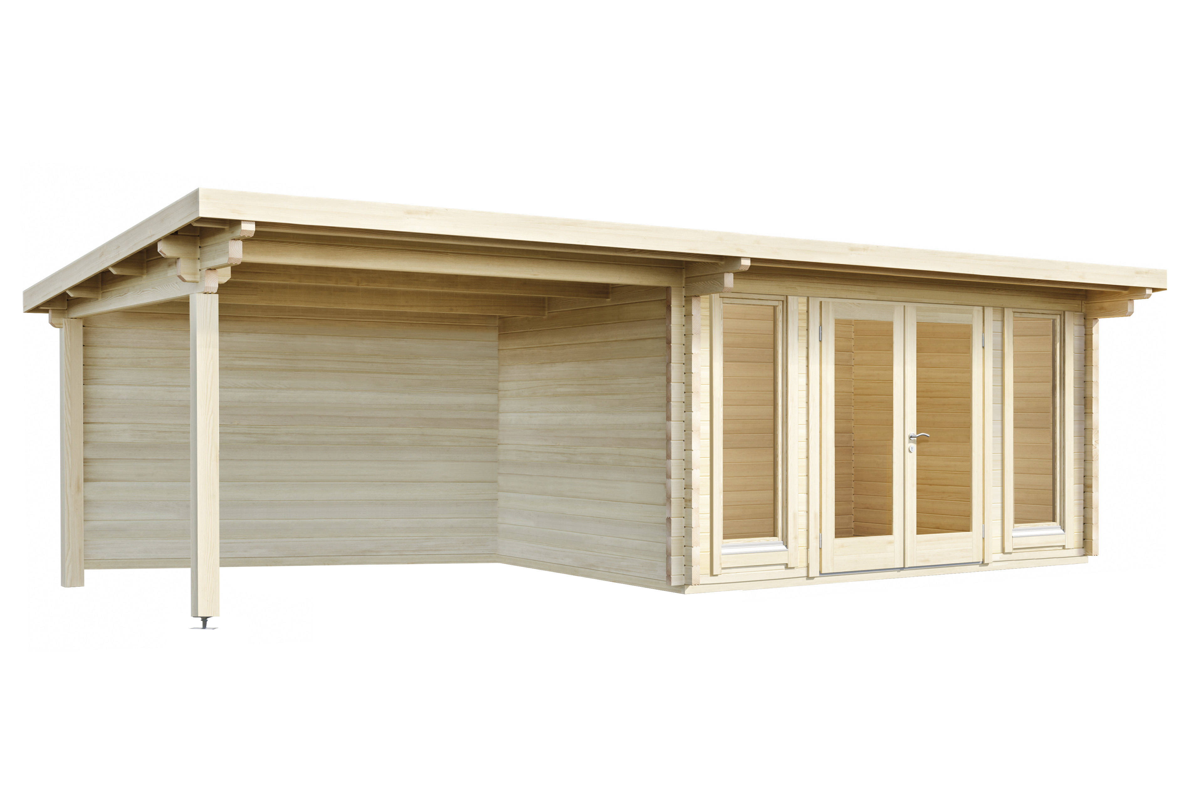 Mit dem Holz-Gartenhaus Belinda 8336 XL mit Lounge 400 Links machen Sie keine halben Sachen. Denn mit ihm bringen Sie Wohnraum plus eine überdachte Freiluftzone in den Garten. Dank zusätzlicher Blockbohlenlage in XL-Raumhöhe! Innen arbeiten Sie auf gut 9 Quadratmetern in wohltuender Ruhe. Ungestört und mitten in der Natur. Umgeben von Wänden aus massiven Blockbohlen aus nordischem Holz. 70 Millimeter stark, stabil und langlebig. Den unvergleichlichen Ausblick genießen Sie durch 2 bodentiefe Fenster und die Leimholz-Doppeltür. Die mit 1,95 Meter Durchgangshöhe besonders groß ist. Hände voll? Die isolierverglasten Fenster öffnen Sie bequem mit einer Hand. Das stabile Pultdach geht links über in die komfortable Lounge mit Rückwand. In der Sie bis in den Herbst hinein traumhafte Stunden erleben. Grillen, feiern, kichern und mit den Nachbarn gackern? Geht alles im Holz-Gartenhaus Belinda 8336 XL mit Lounge 400 Links! Für dieses Gartenhaus erhalten Sie bei uns umfangreiches Zubehör. Dank Modulbauweise können Sie es selbst montieren.