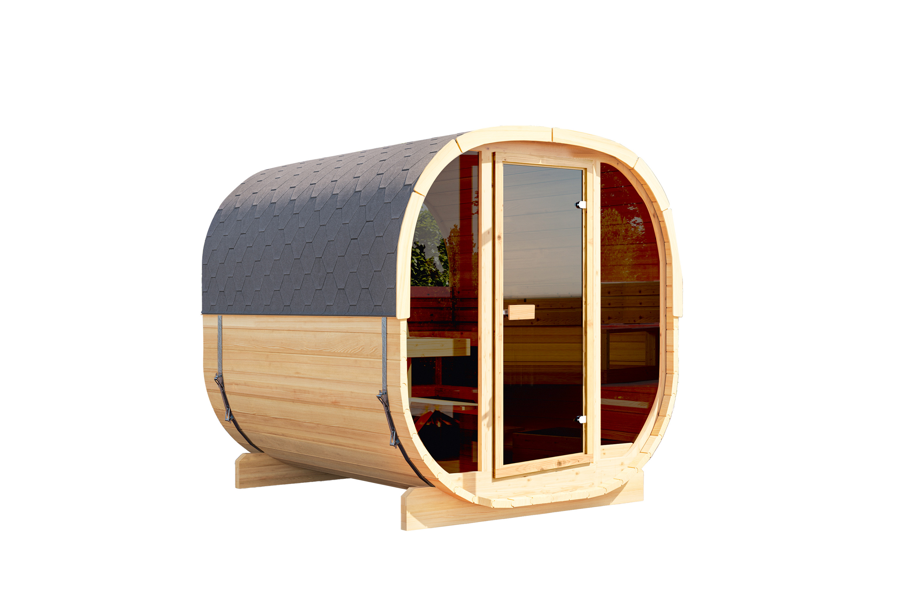 Sie erhalten dieses Saunafass als Bausatz mit Korpuswänden aus naturbelassenem Fichtenholz (42 Millimeter). Einschließlich Holzfront (28 Millimeter, naturbelassen) mit Holztür und 2 feststehenden Fenstern, Halbglasrückwand (unten 28 Millimeter starkes und naturbelassenes Holz, oben Glas) sowie 2 komfortablen, geraden Saunabänken mit Rückenlehnen.