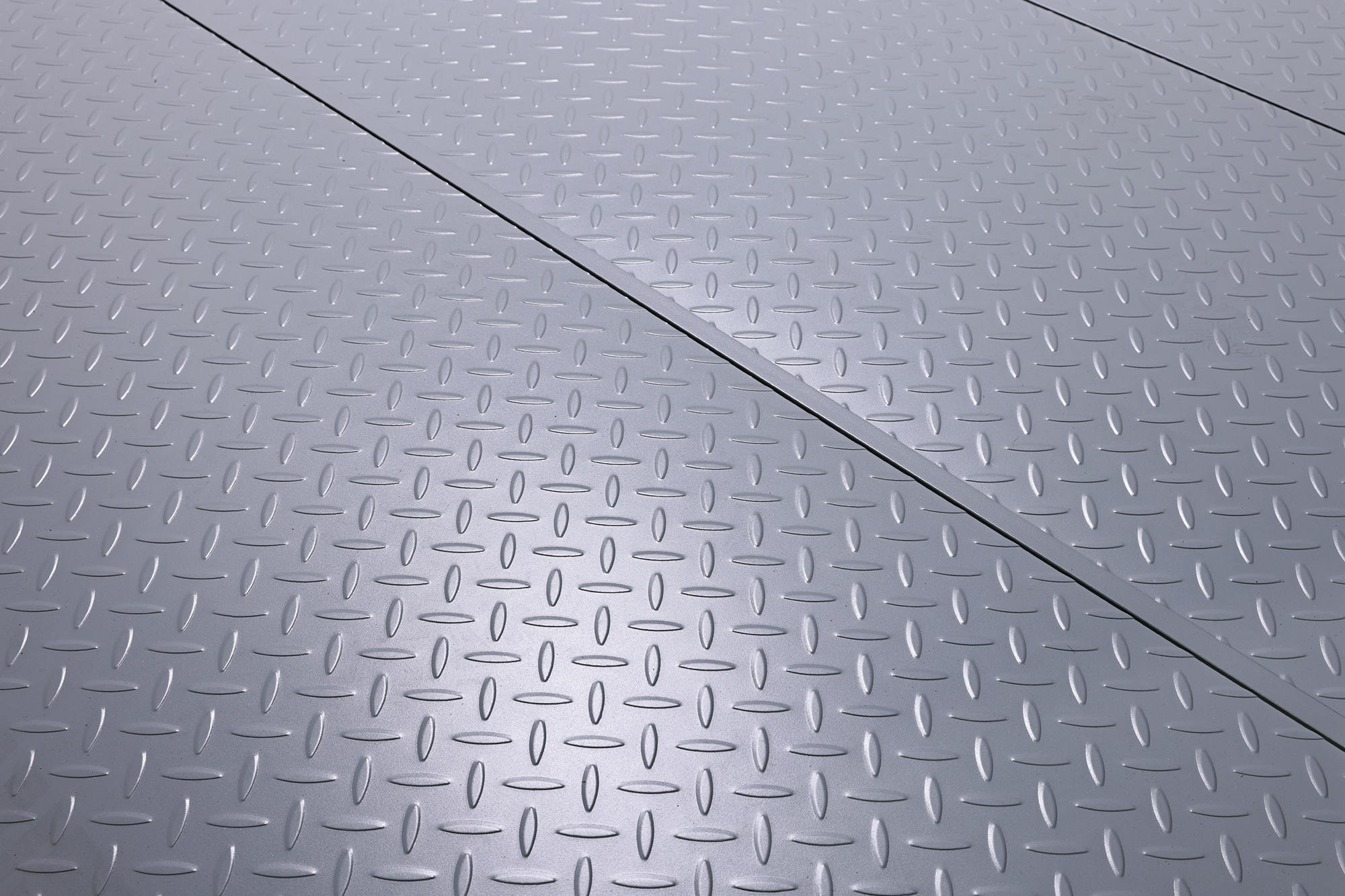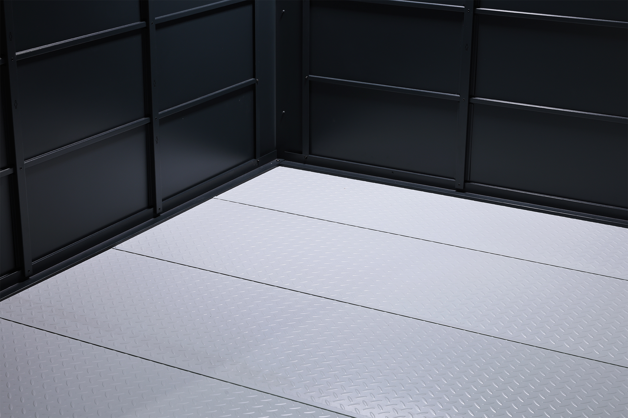 Der hellgraue, rutschfeste Stahlboden mit 30 mm starken XPS-Hartschaumplatten sorgt für Stabilität und Dämmung und schützt so zuverlässig vor Bodenkälte – die perfekte Ergänzung für Ihr Metallhaus.