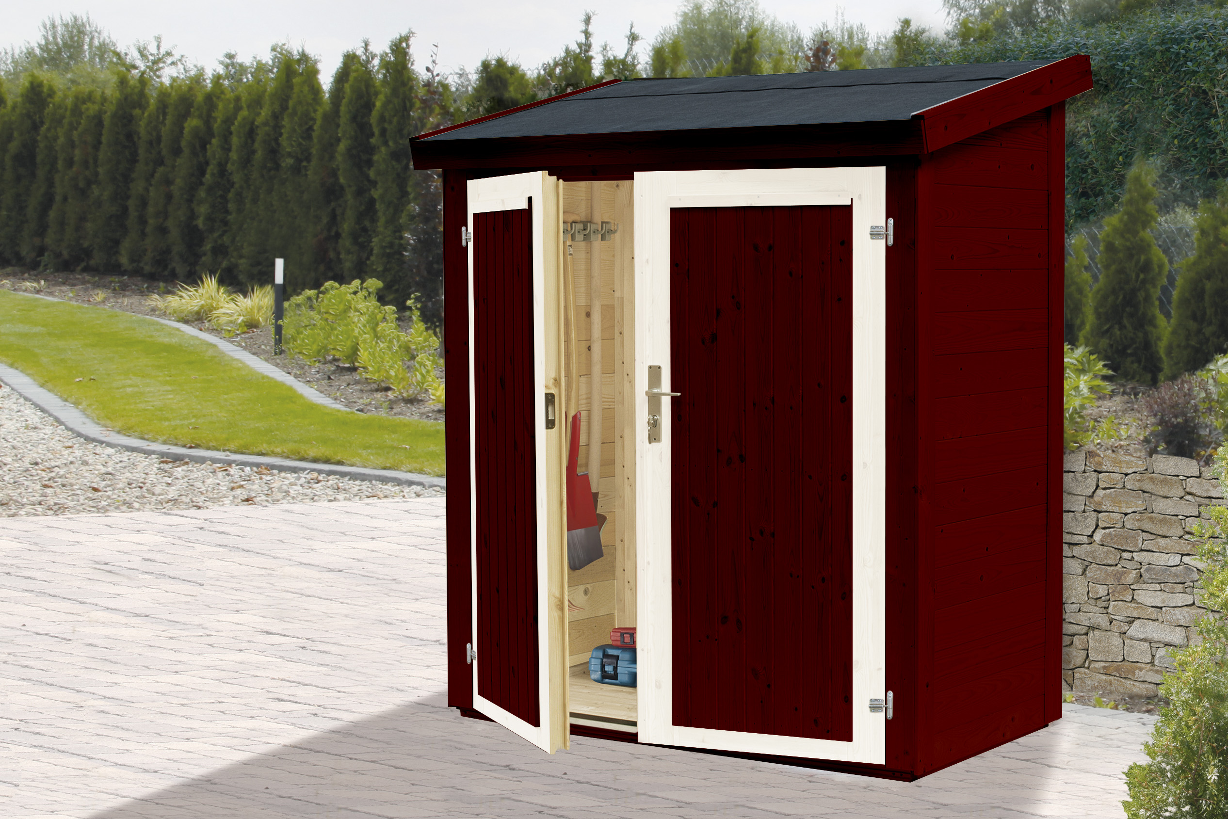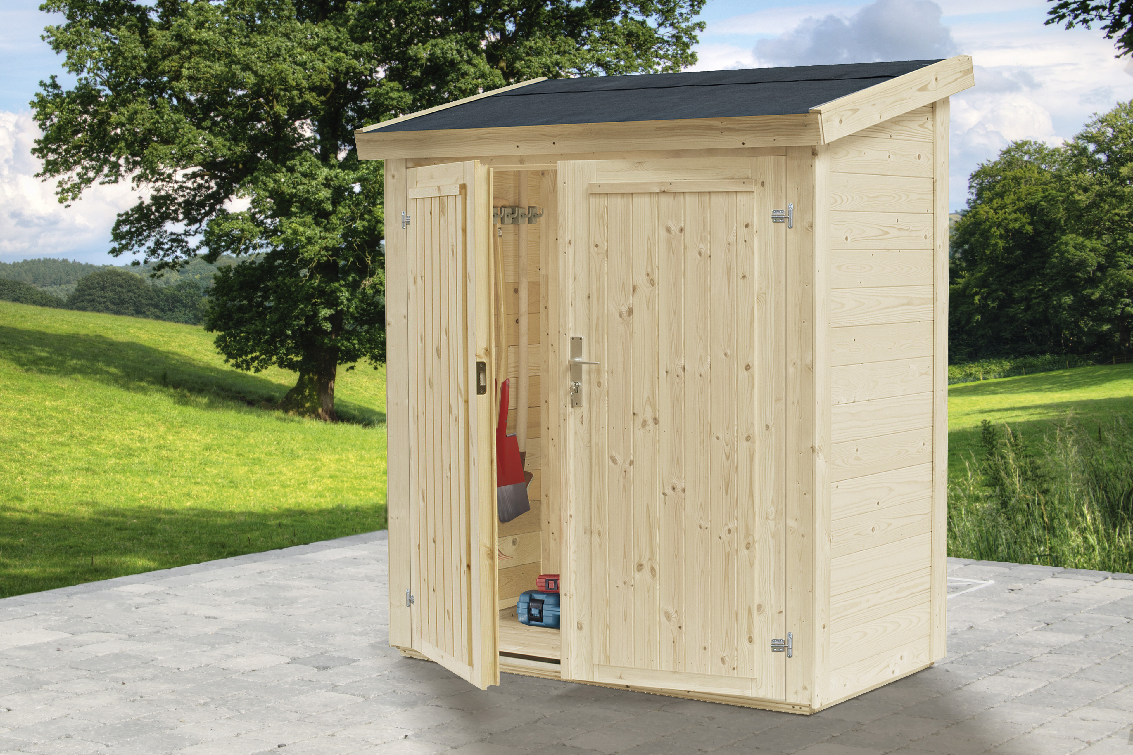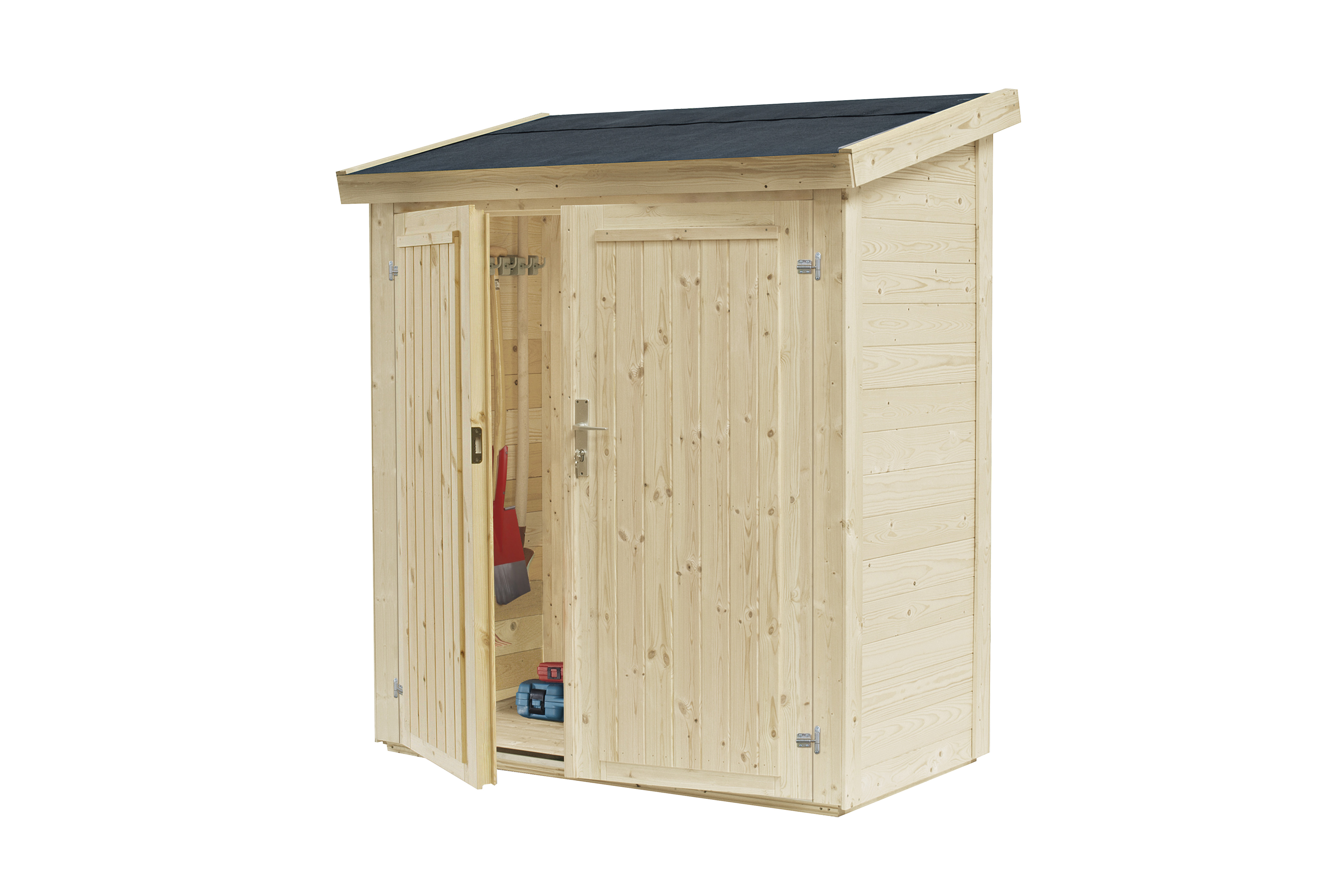 Es finden alle wichtigen Gartenutensilien ihren Platz. Dank der Wandstärke von 18 mm sind Ihre Gerätschaften sicher und wettergeschützt.