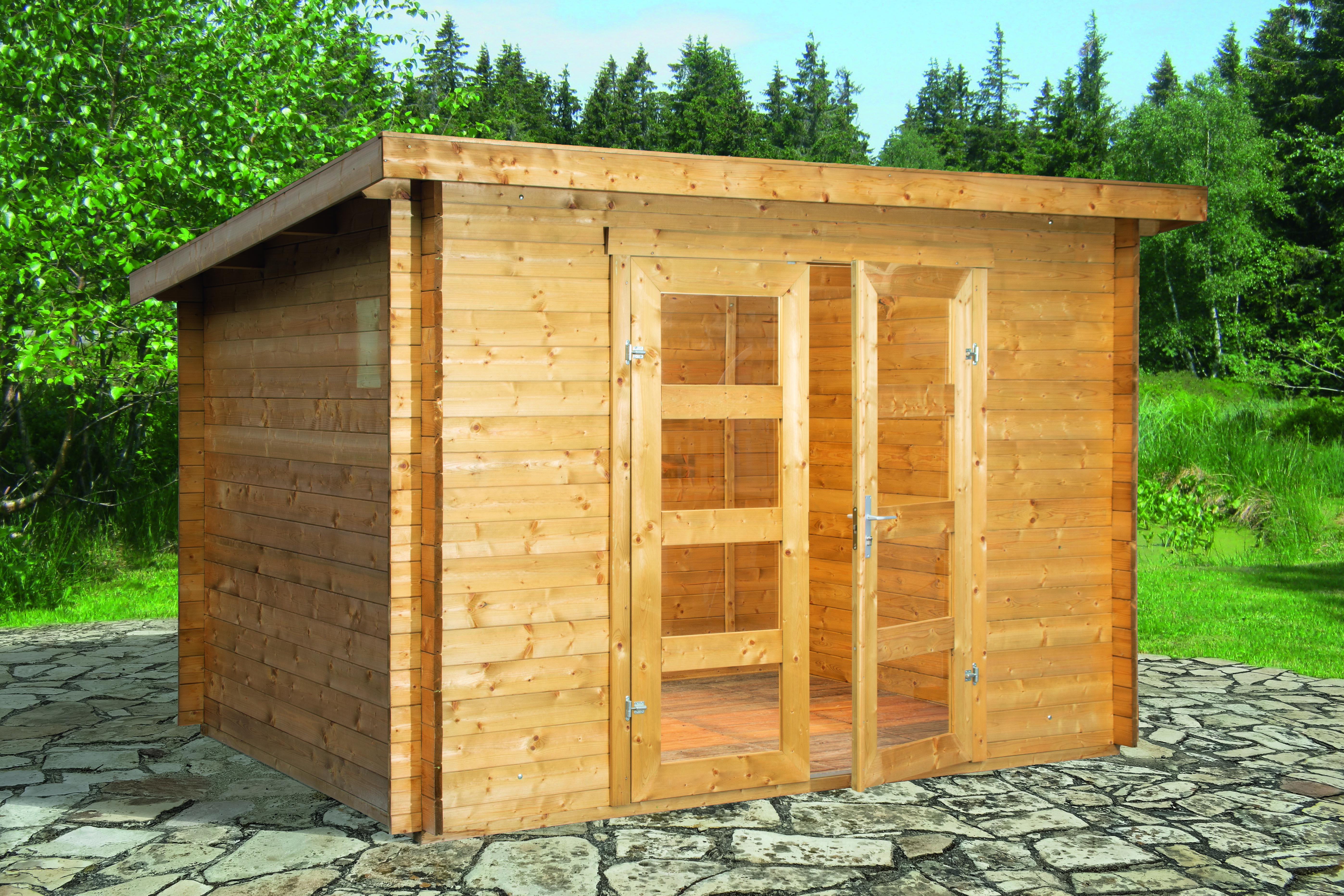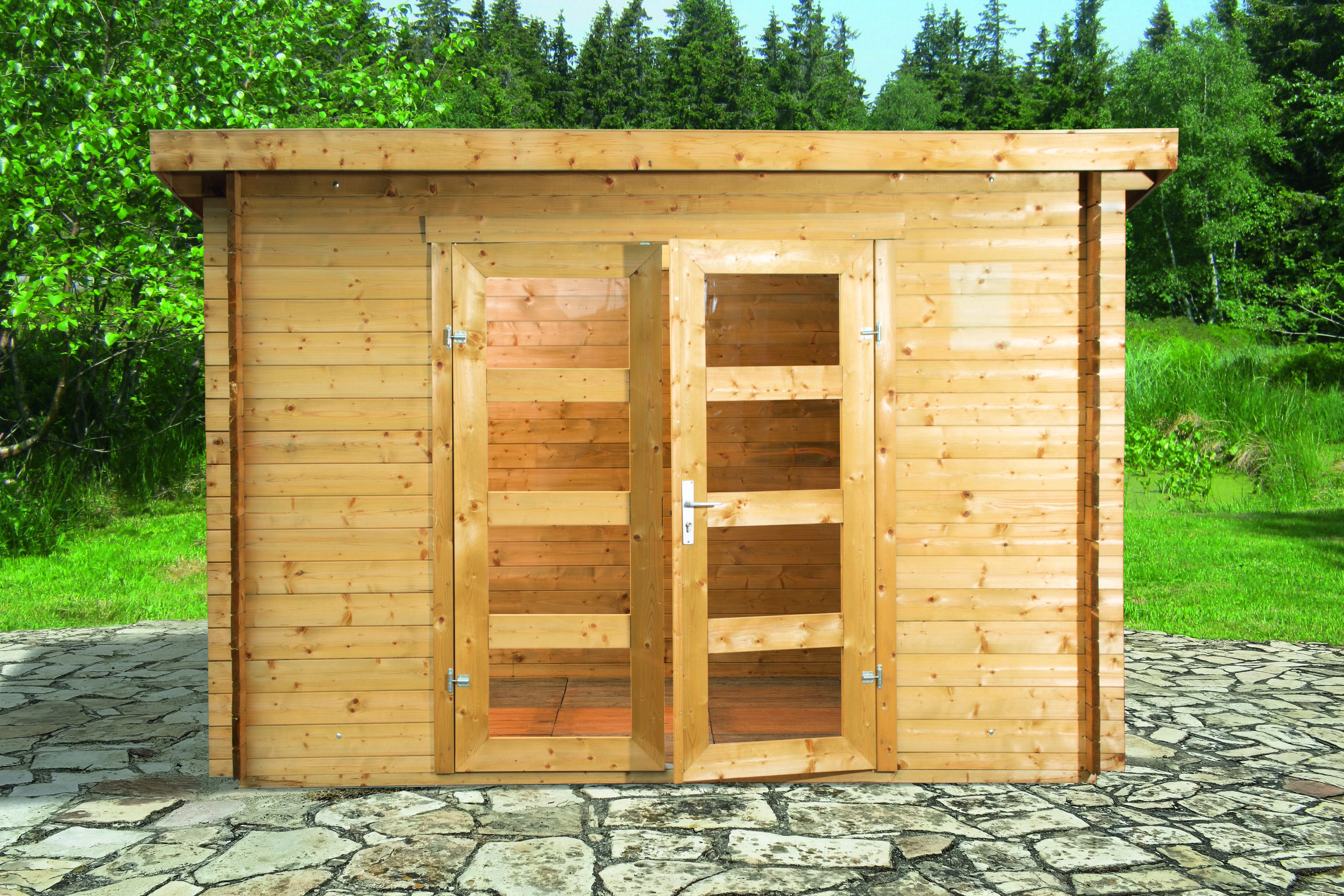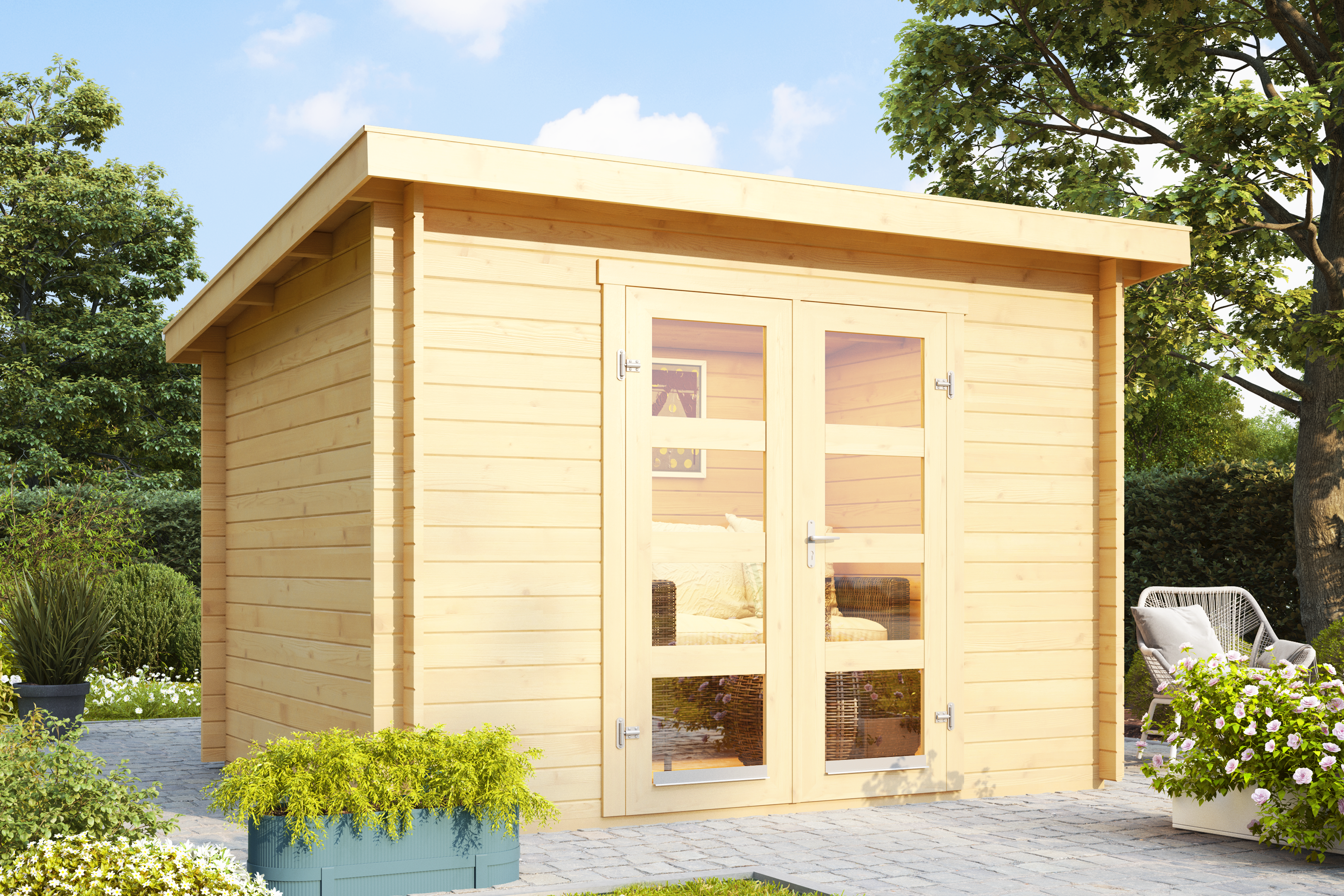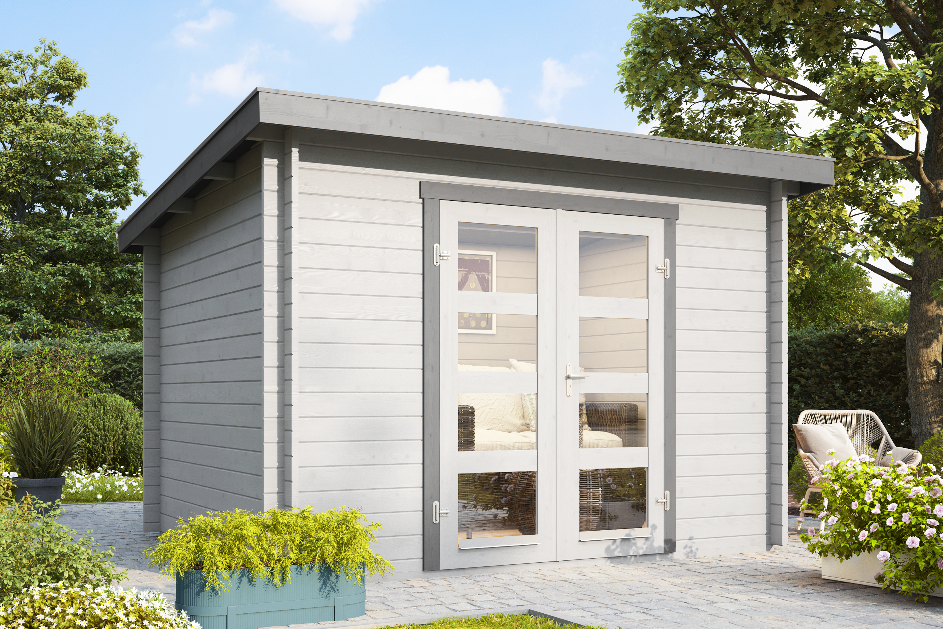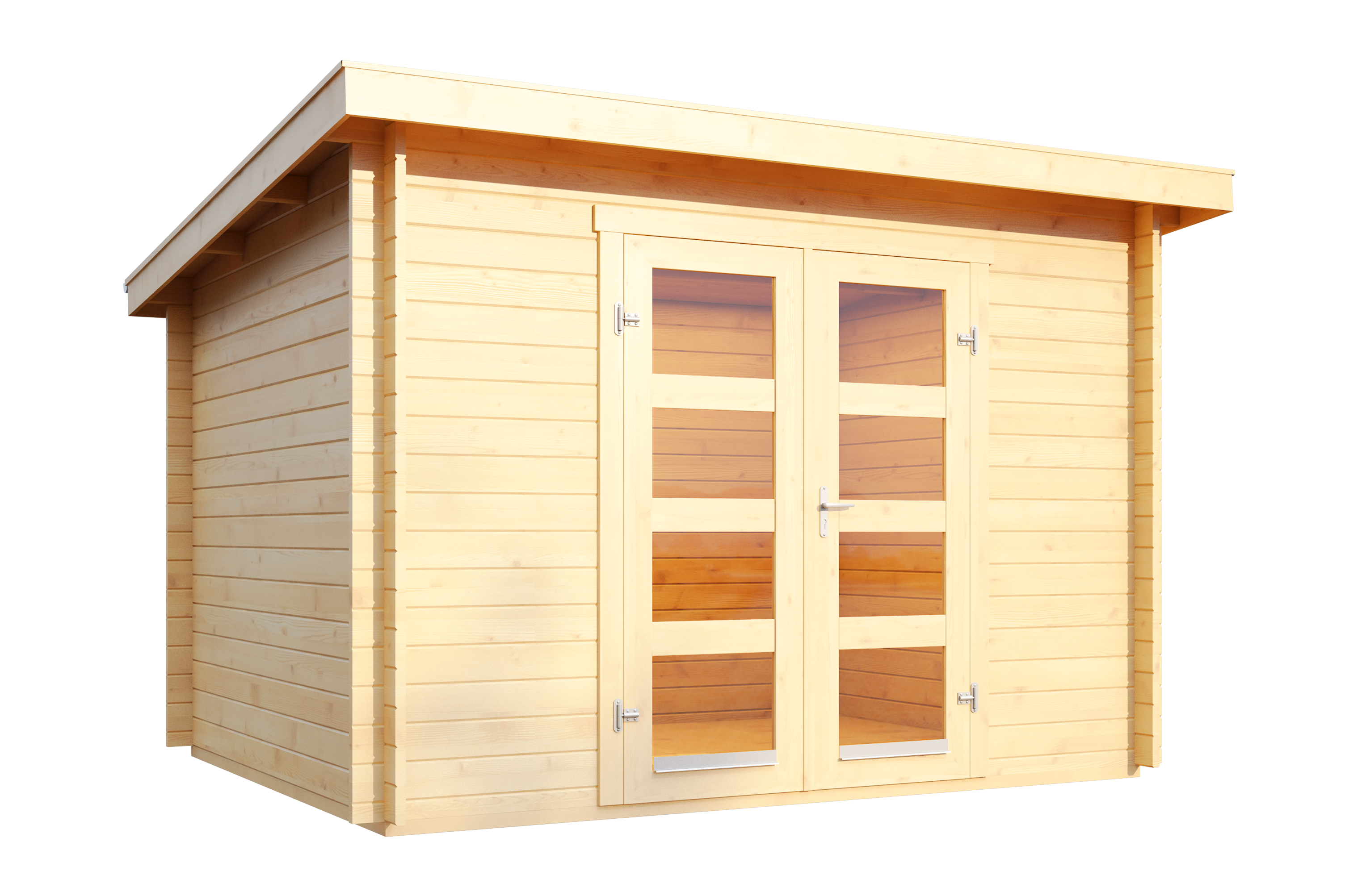 Den optischen Akzent setzt die zweiflügelige Doppeltür dieses Holz-Gartenhauses.