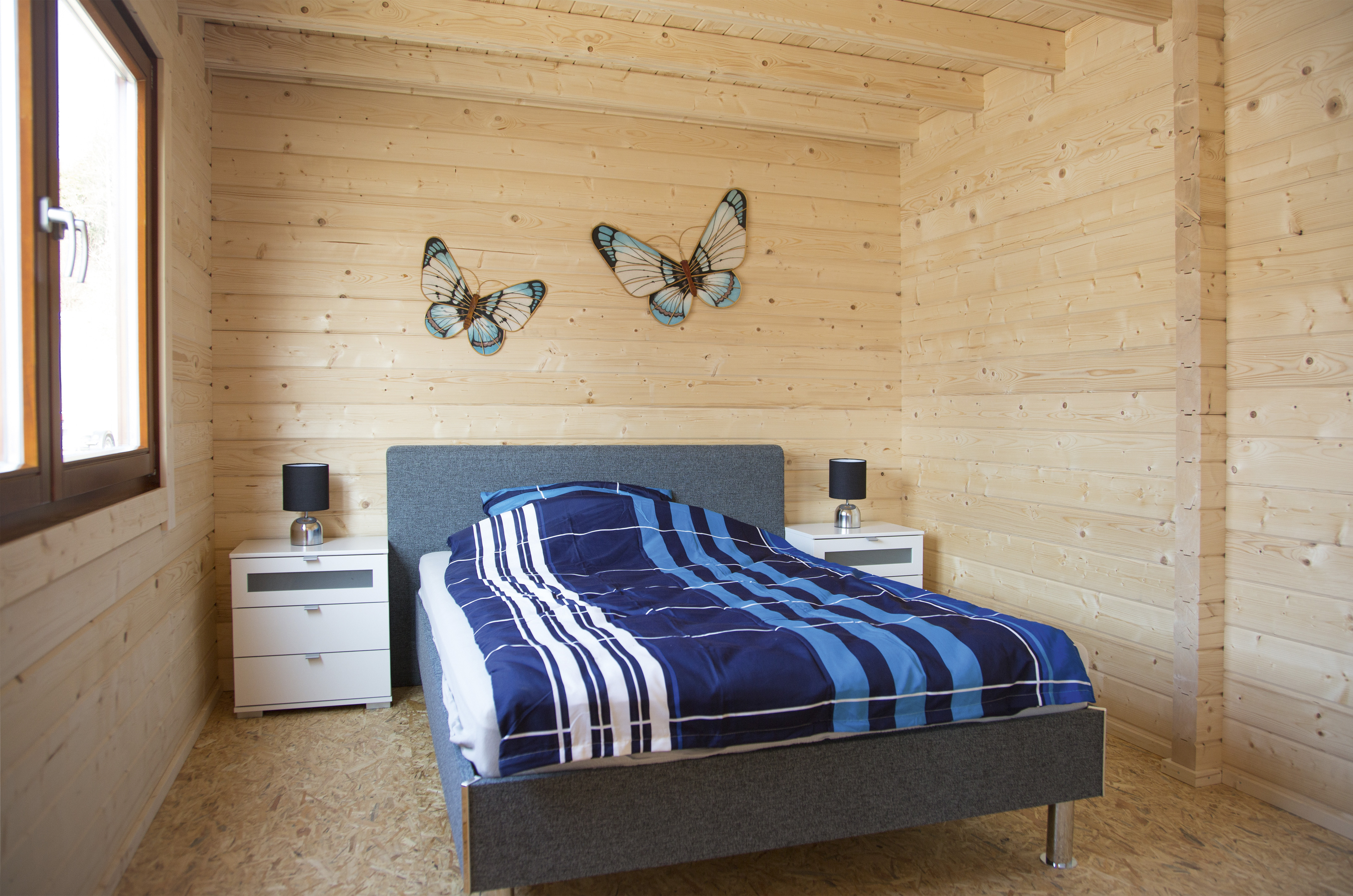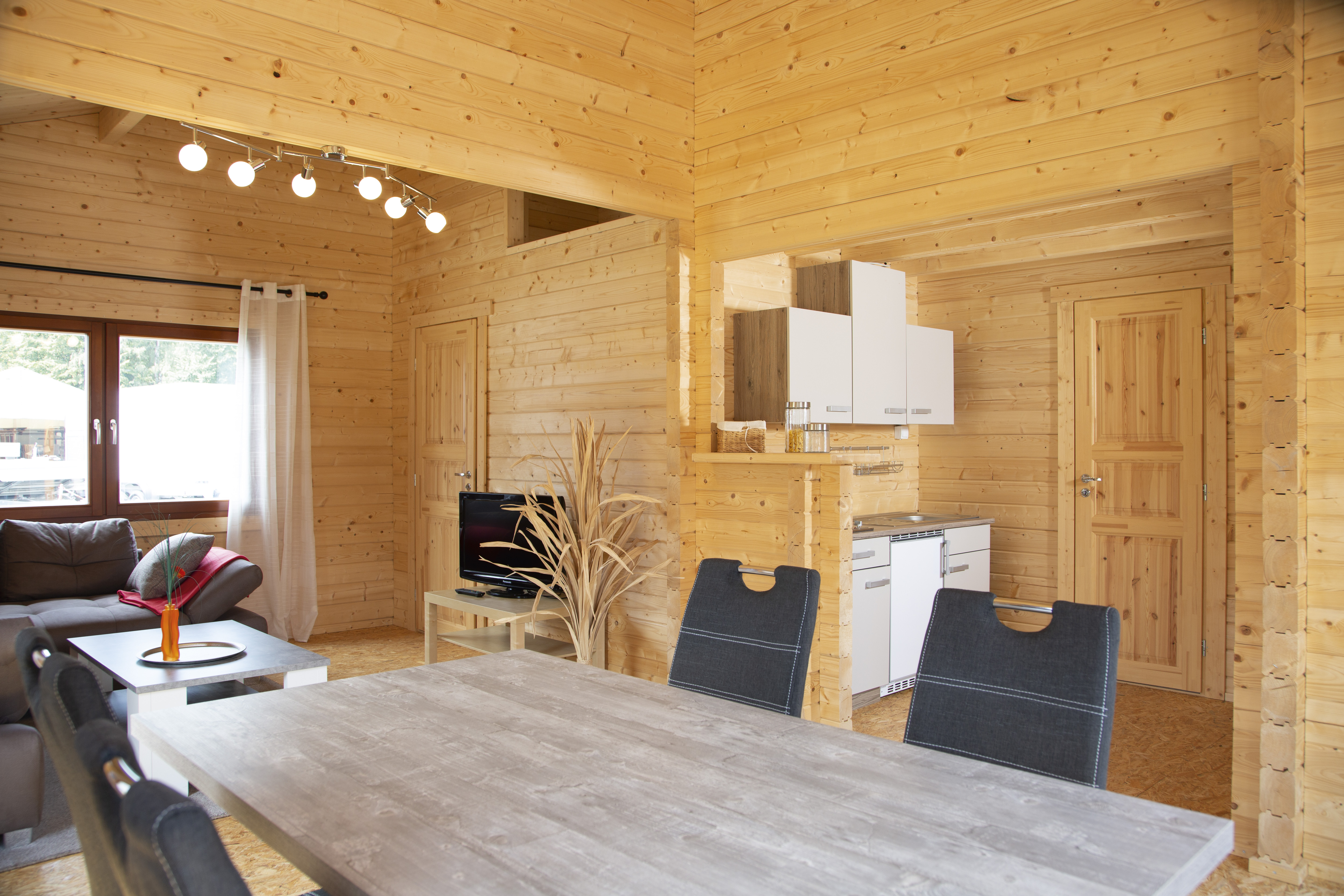 Die isolierverglasten Dreh-Kipp-Fenster des Ferienhauses aus Holz halten die Wärme im Haus und schützen vor Kälte. Wie die bodentief verglaste Doppeltür aus Leimholz lassen sie angenehmes Tageslicht in die 4 Räume. Die Sie jederzeit individuell einrichten können.