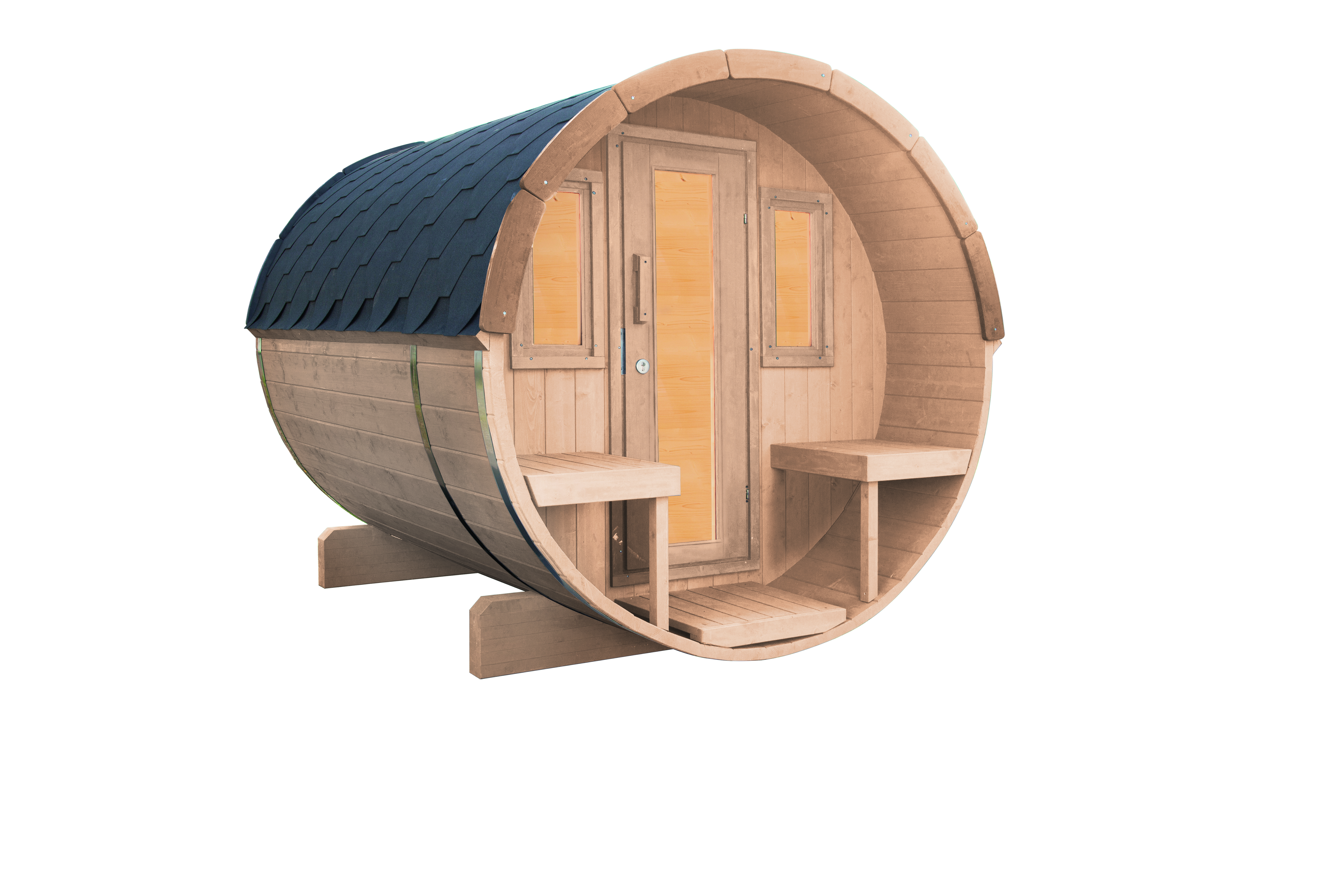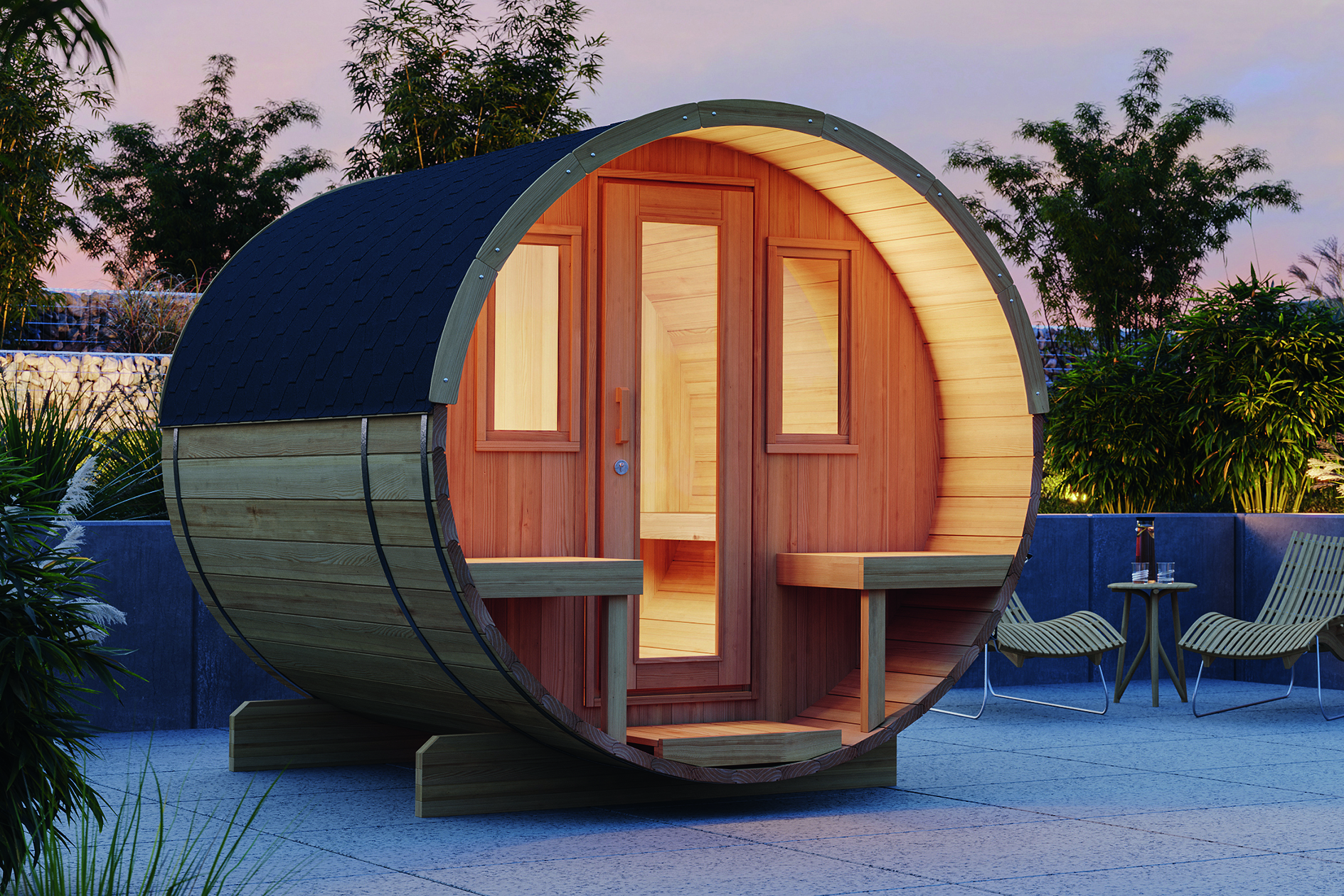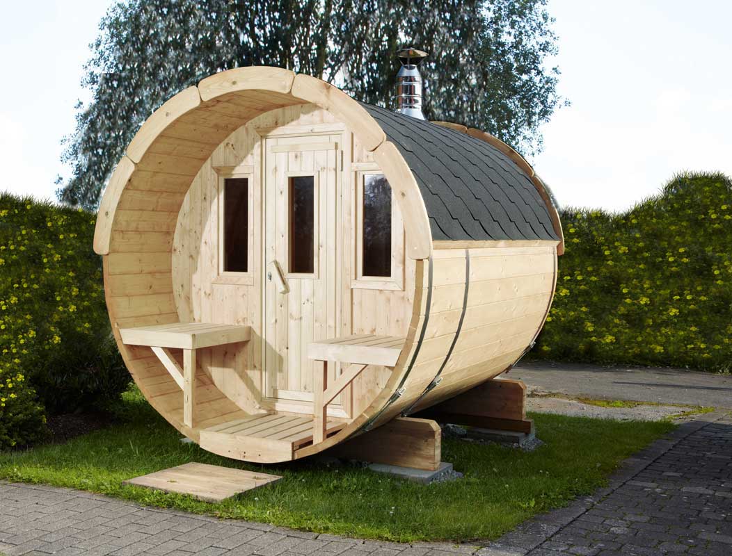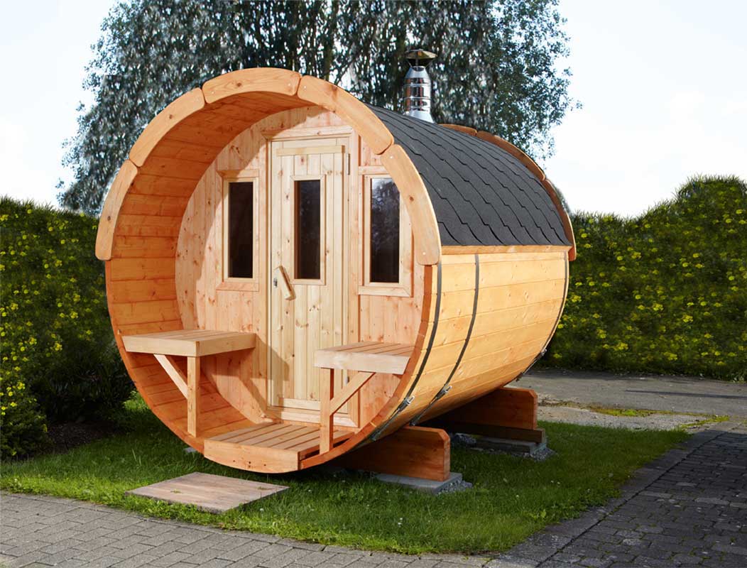 Das Saunafass wird durch seine außergewöhnliche Erscheinung der Blickpunkt in Ihrem Garten.