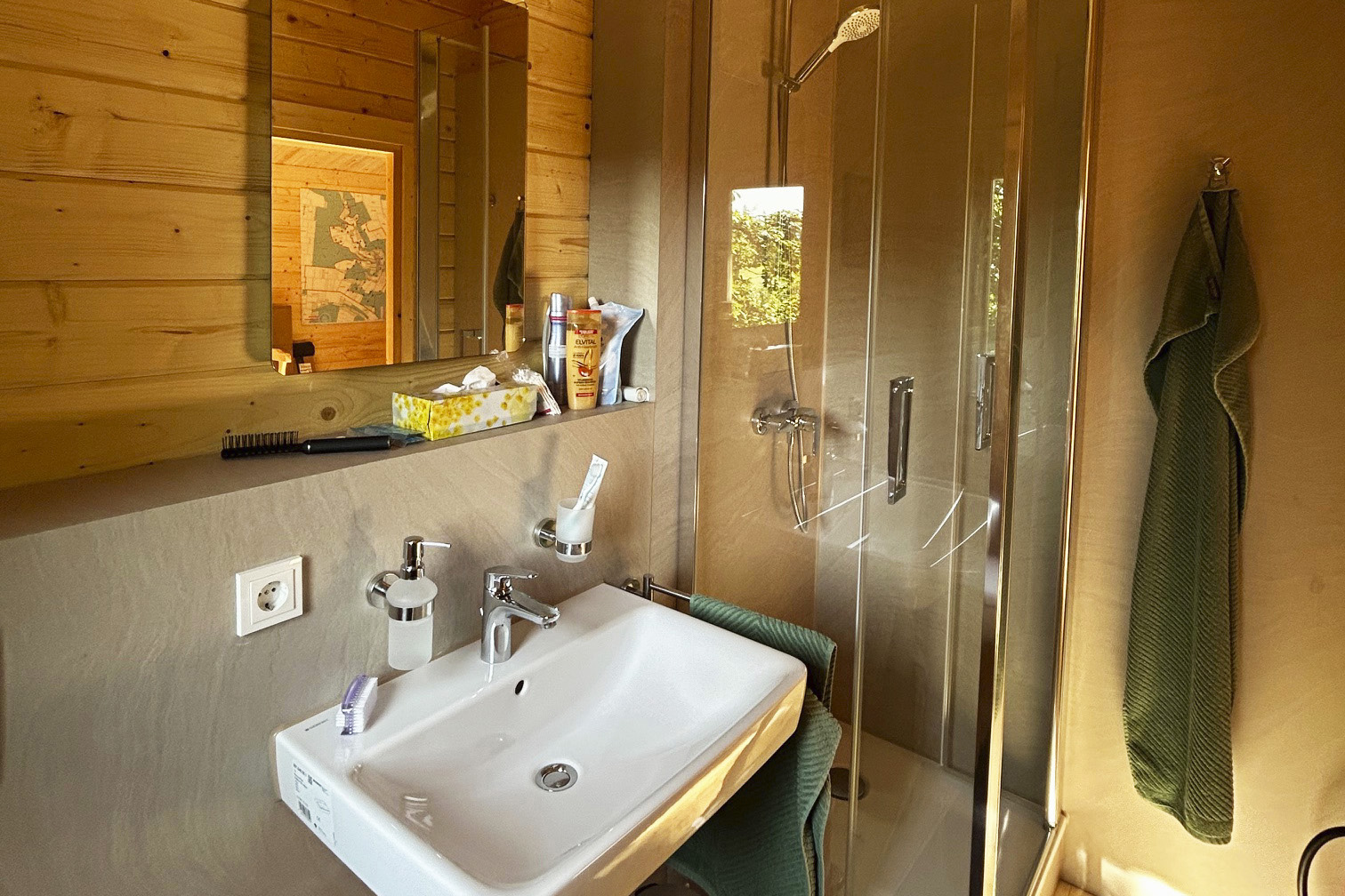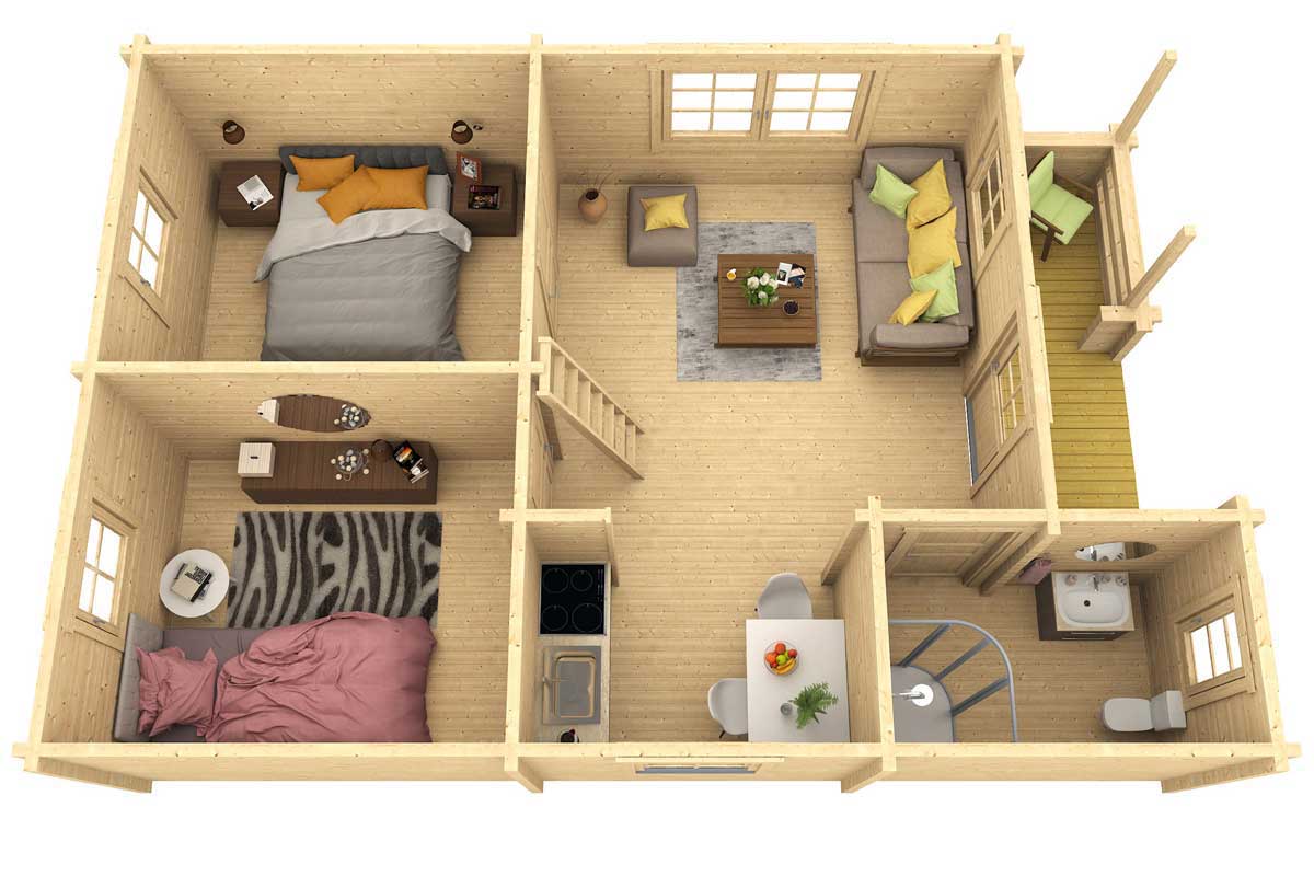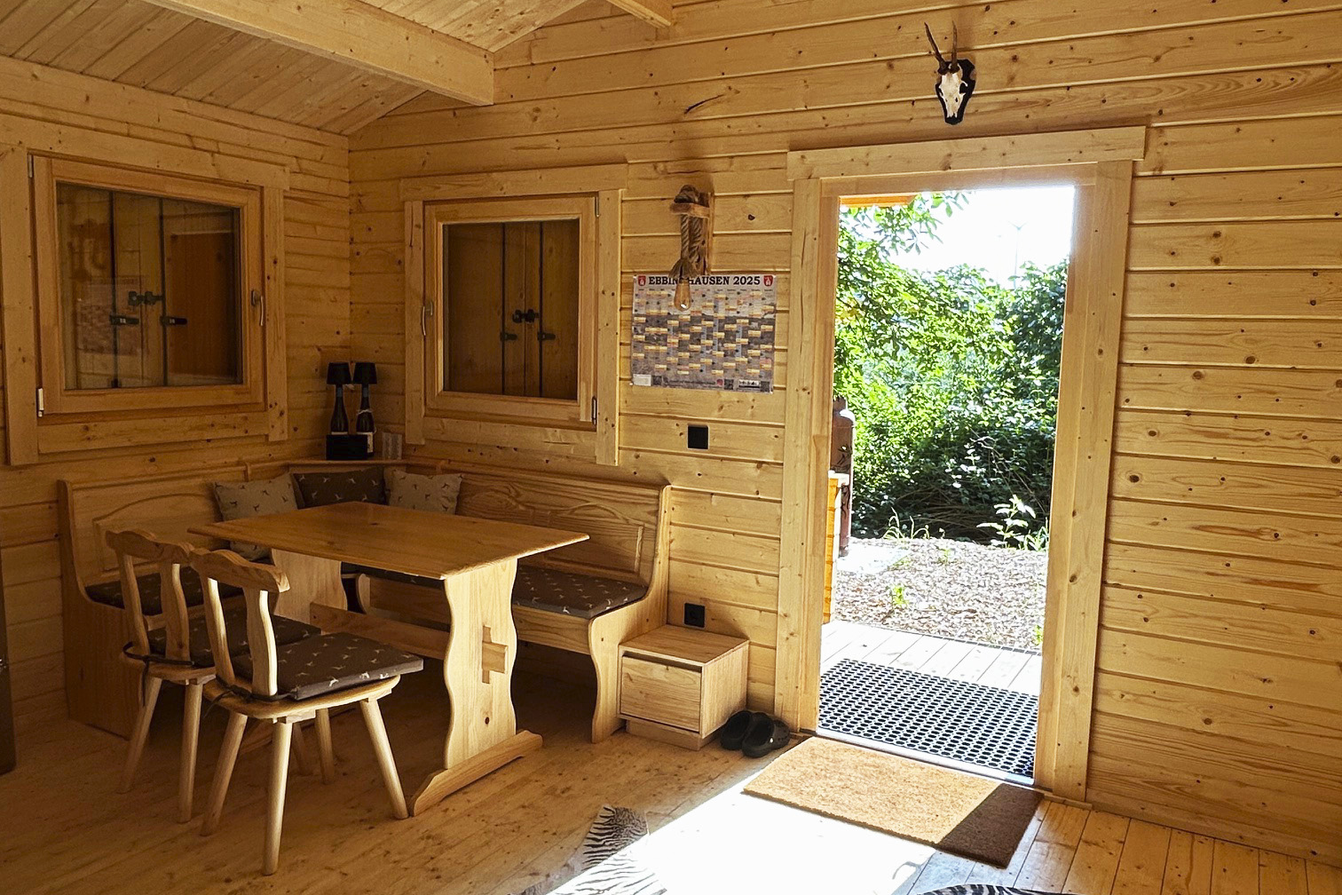 Starten Sie den Tag auf der überdachten Veranda mit einem ausgiebigen Frühstück und der frischen Luft. Sie müssen auch nicht an kühlen Tagen oder im Winter auf Ihren Rückzugsort verzichten, denn durch die Wandstärke von 70 mm sind Sie vor Wind, Regen und Kälte geschützt.