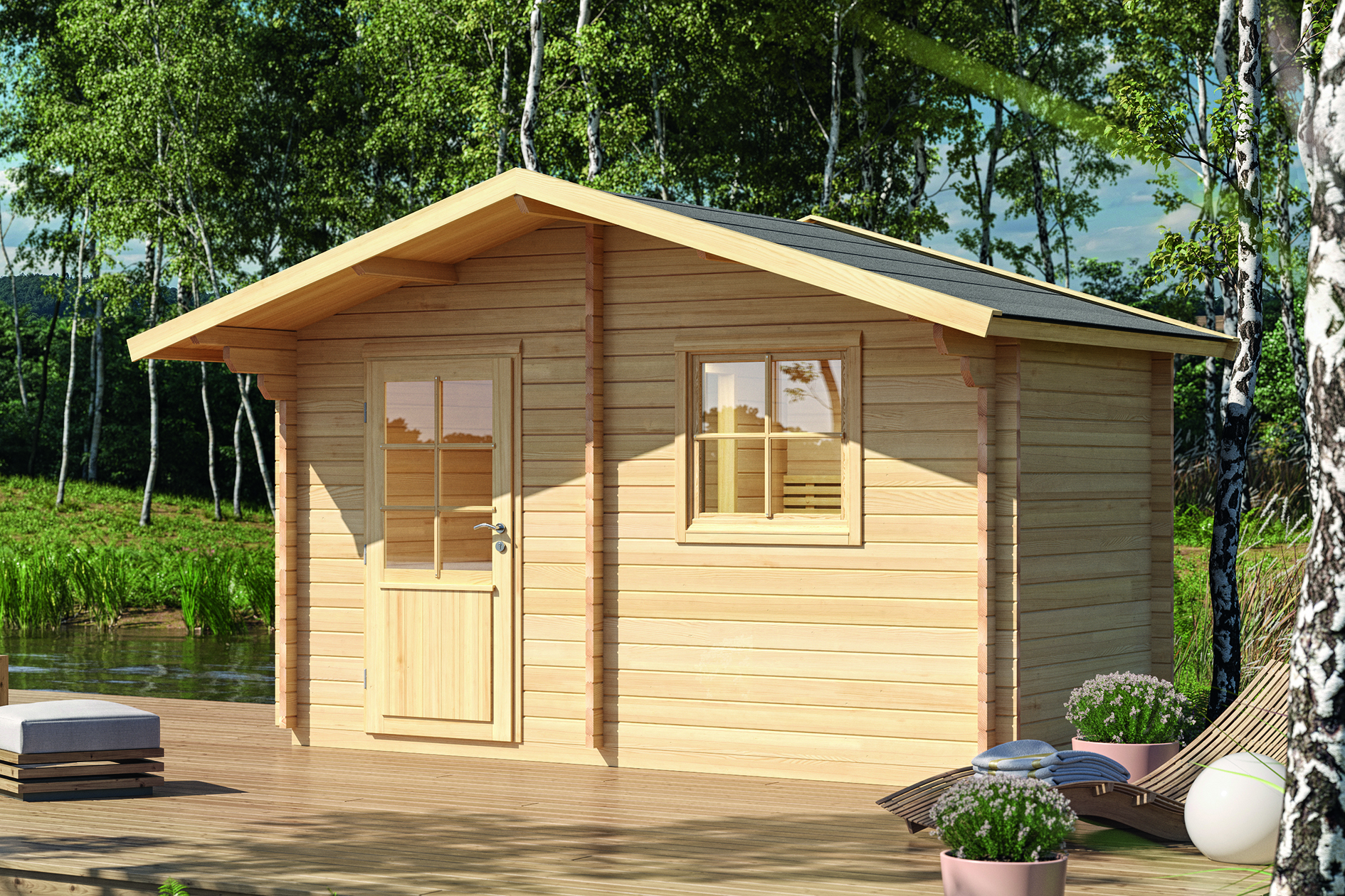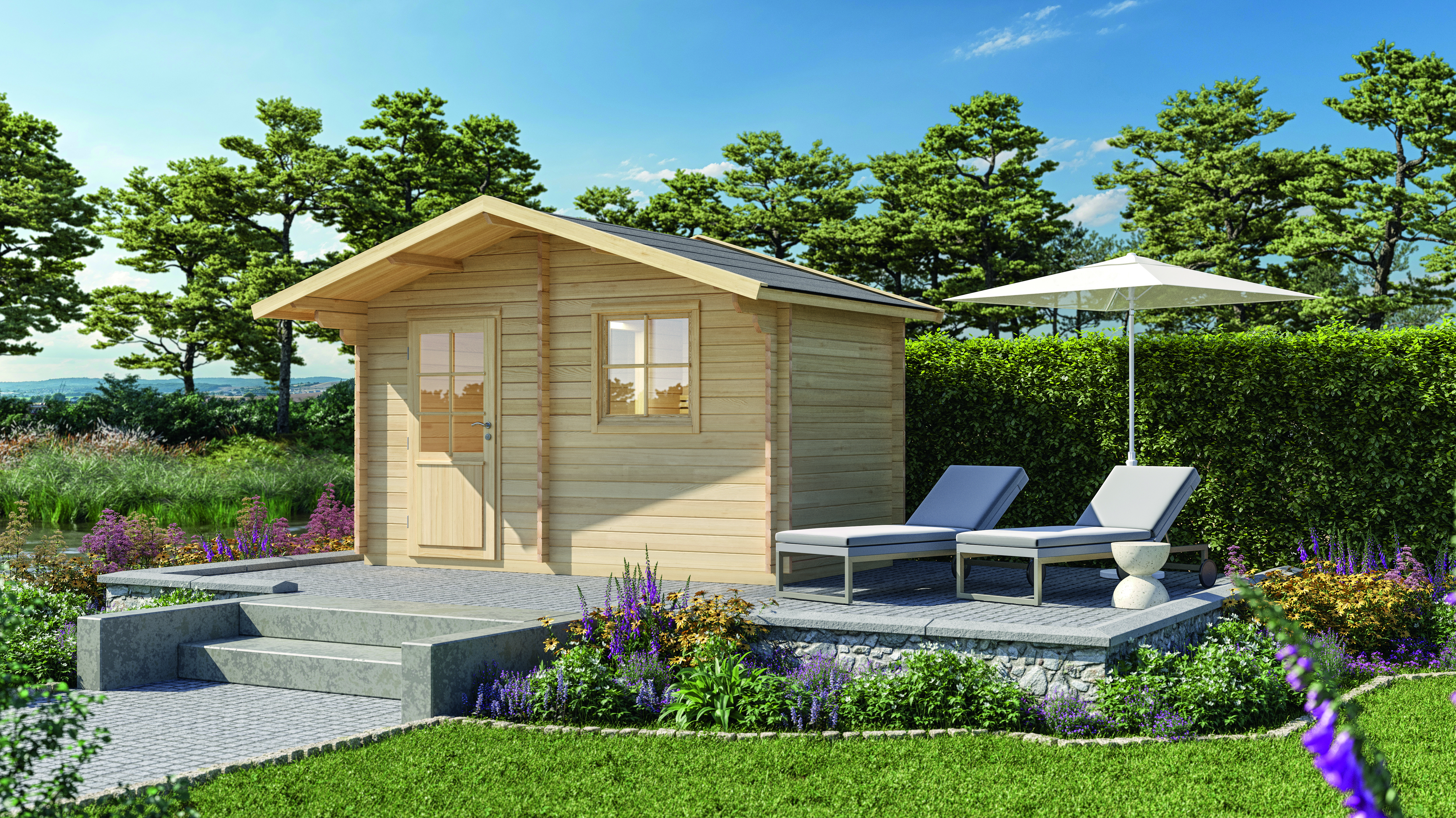 Durch das Einzelfenster und die halbverglaste Tür mit Isolierglasscheiben fällt angenehmes Tageslicht ins Innere. Und Sie schauen beim Relaxen verträumt raus ins Grüne. 70 Millimeter Wandstärke und die isolierte Zwischendecke im Saunaraum halten die Wärme.