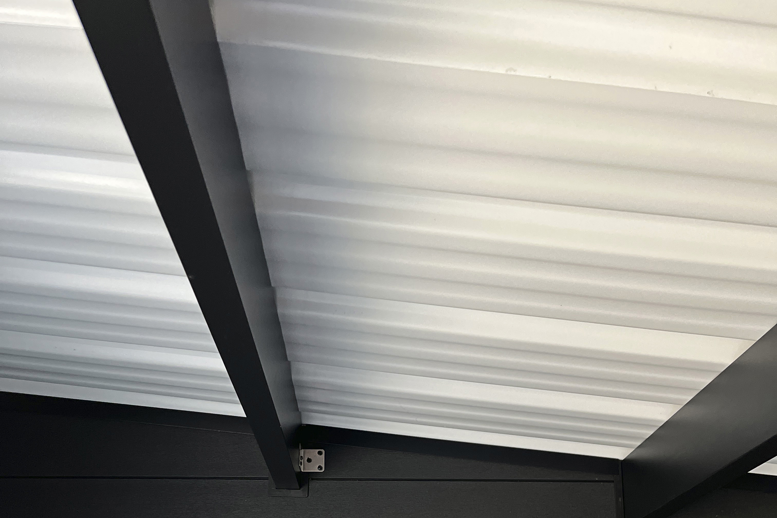Unter einem tragfähigen Metalldach. Denn Dachsparren, Dachblende und auch der Bodenrahmen sind aus Aluminium. Das Material des Daches ist verzinkt und lackiert. Im Lieferumfang ist die Dachrinne bereits enthalten. Regelmäßig streichen? Nein, ist nicht nötig!