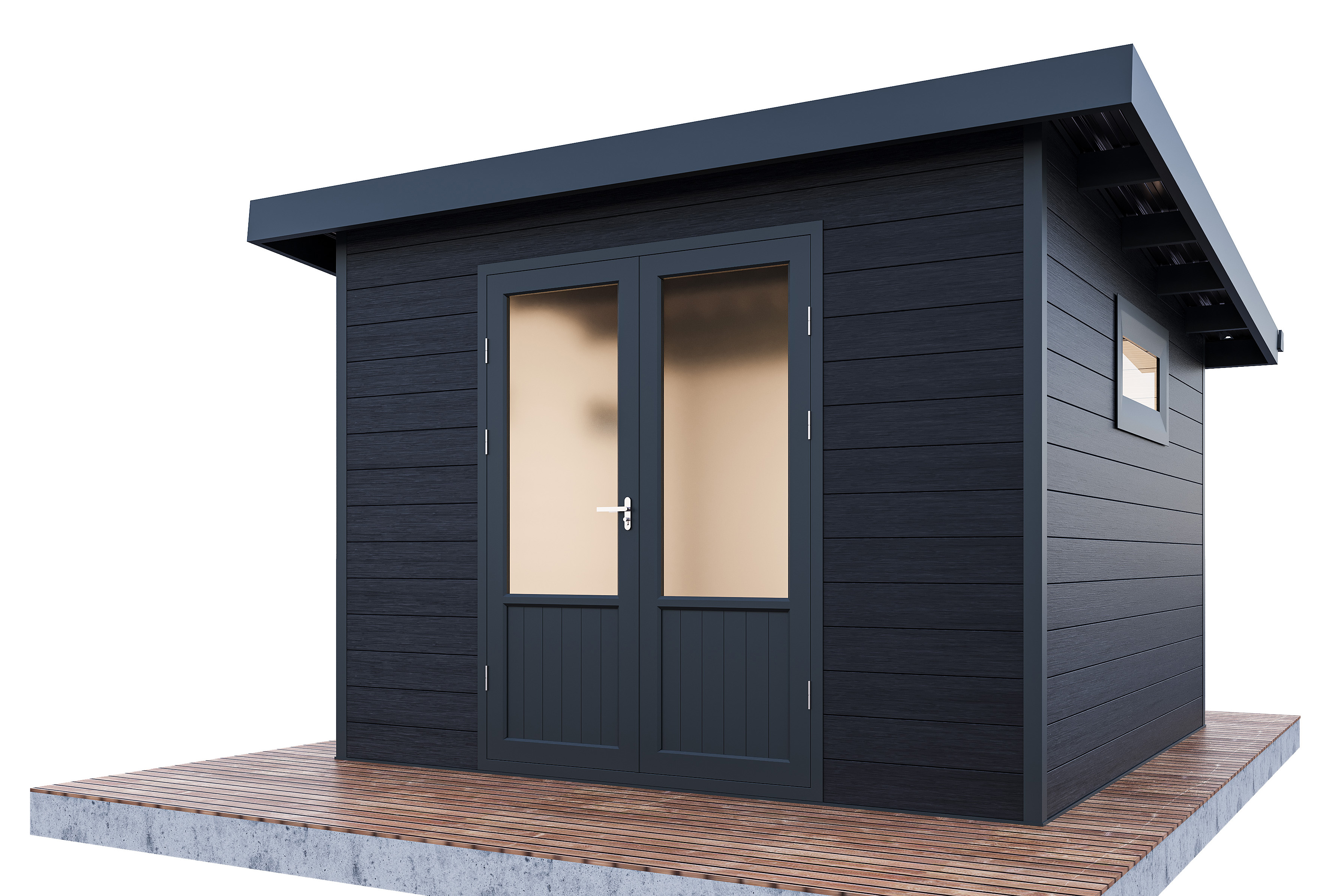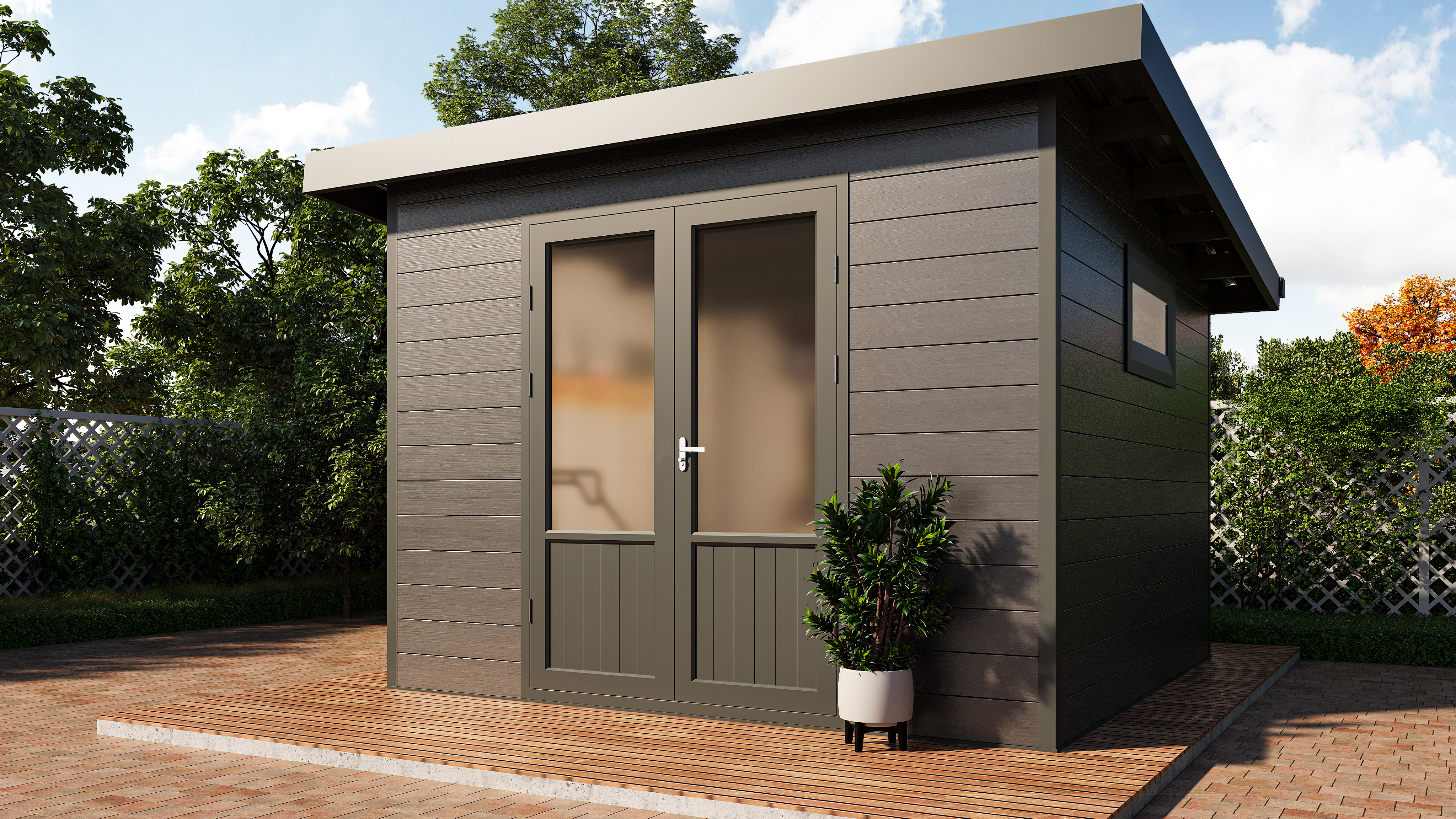 Erfüllen Sie sich diesen Traum mit diesem wartungsarmen WPC-Gartenhaus. Dessen coextrudierte WPC-Wandbohlen entweder im Farbton Anthrazit oder, wenn die andere Seite der Bohle verwendet wird, in Hellgrau sichtbar ist.