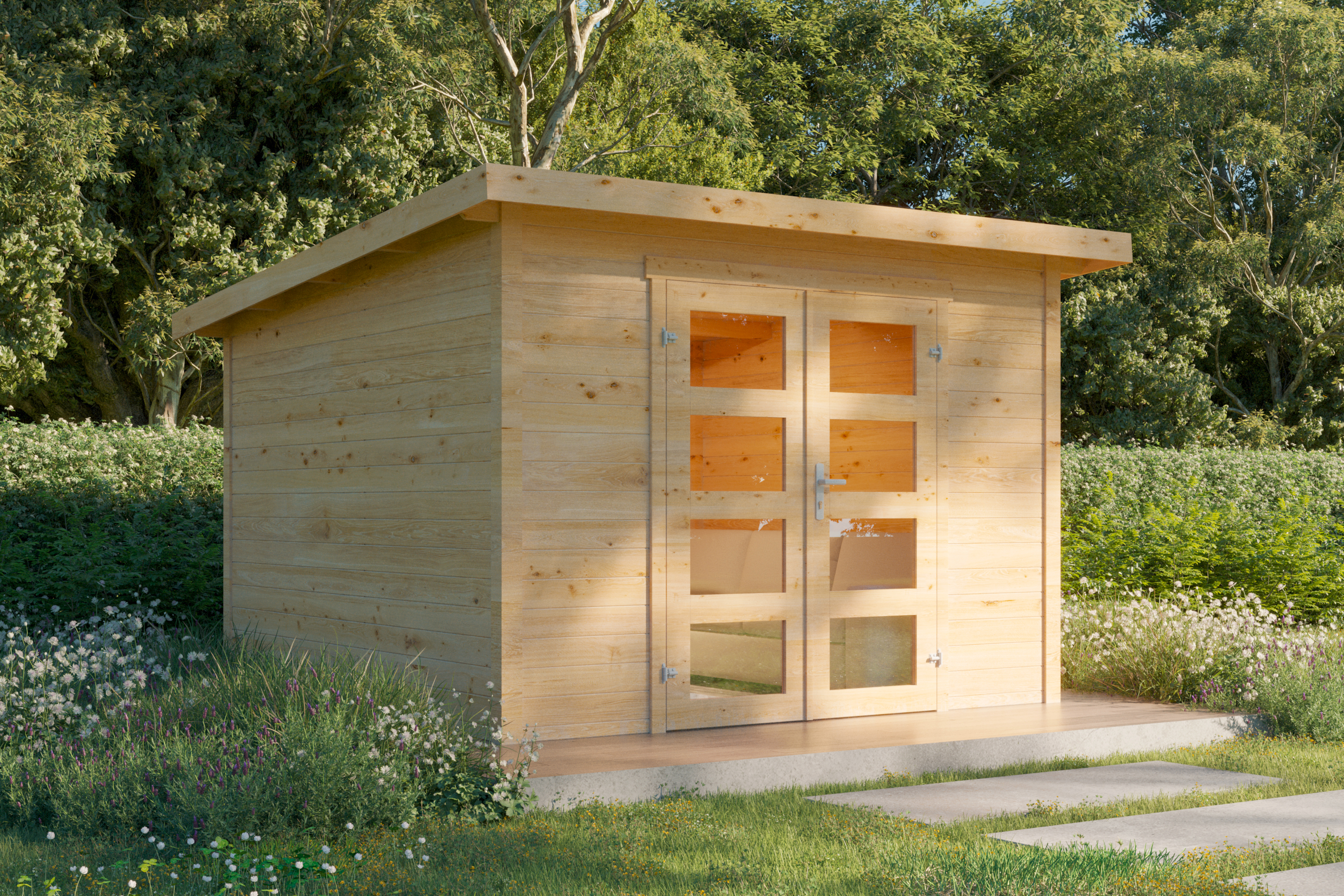 Den optischen Akzent setzt die zweiflügelige Doppeltür dieses Holz-Gartenhauses.